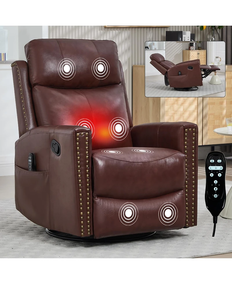 360 swivel and rocking recliner w/ massage and heat! Genuine leather, easy to clean. Reclines to 155. Timer and 3 massage modes. Easy assembly.