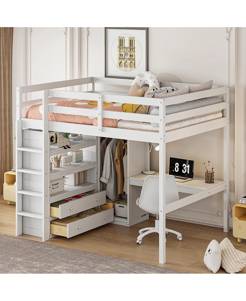 Maximize your space with this versatile white full-size loft bed. Features a built-in wardrobe, desk, shelves, and drawers for ample storage. Crafted from pine wood and Mdf for stability.