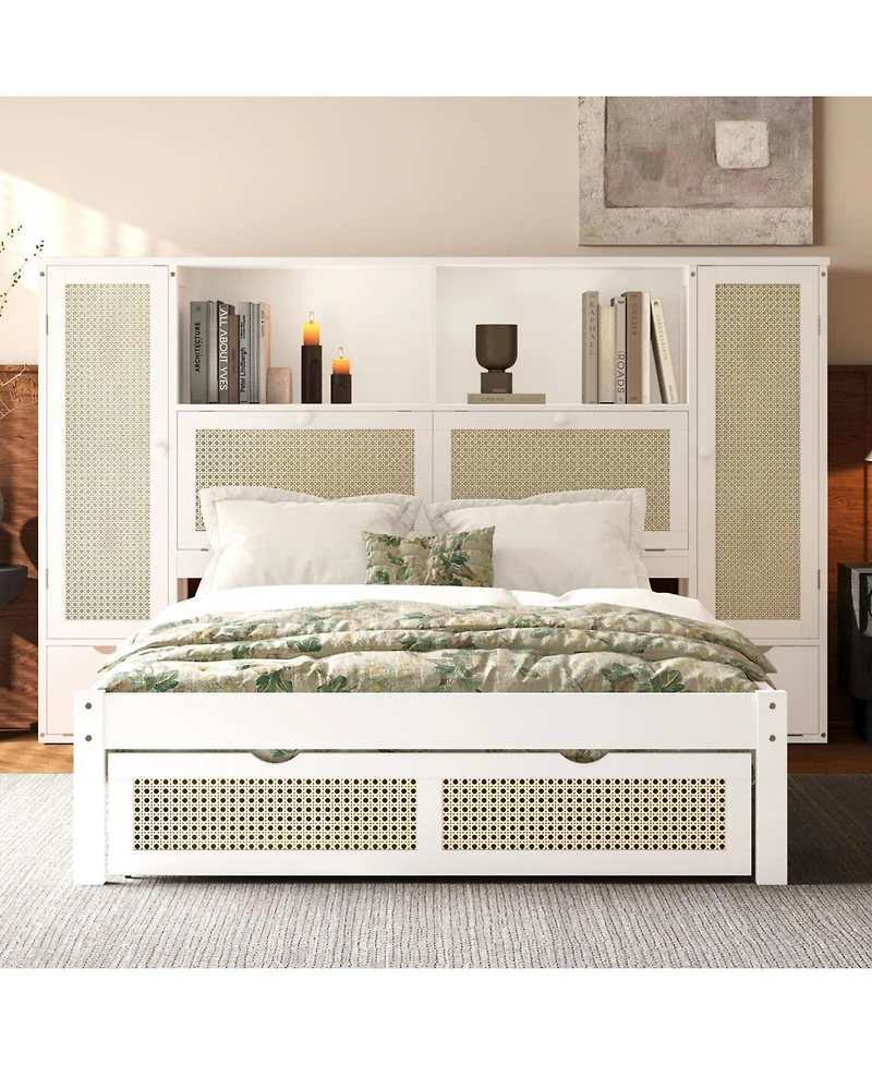 Stylish and functional Twin Size Wooden Bed with two storage lockers, a drawer, and a storage rack on the headboard. Crafted from high-quality wood with a natural rattan design, bringing elegance and practicality to your bedroom.