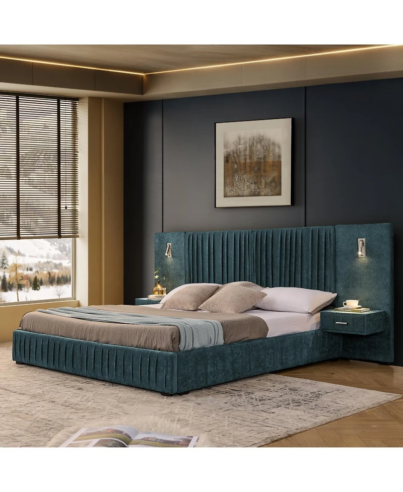 Modern King Upholstered Platform Bed in Blue+Green. Features a unique wave-like headboard, integrated bedside table, and adjustable lamps. Easy assembly. 80.75"" 80.5"" 12"" .