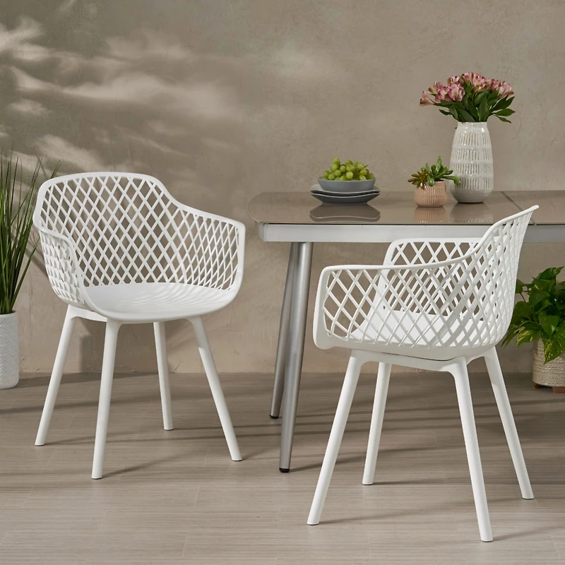 Elevate your outdoor dining with our modern and durable dining chair set. Crafted from weather-resistant materials, these chairs offer lasting use and stability. Their sleek design featuring a diamond mesh pattern adds a touch of style to your outdoor space.