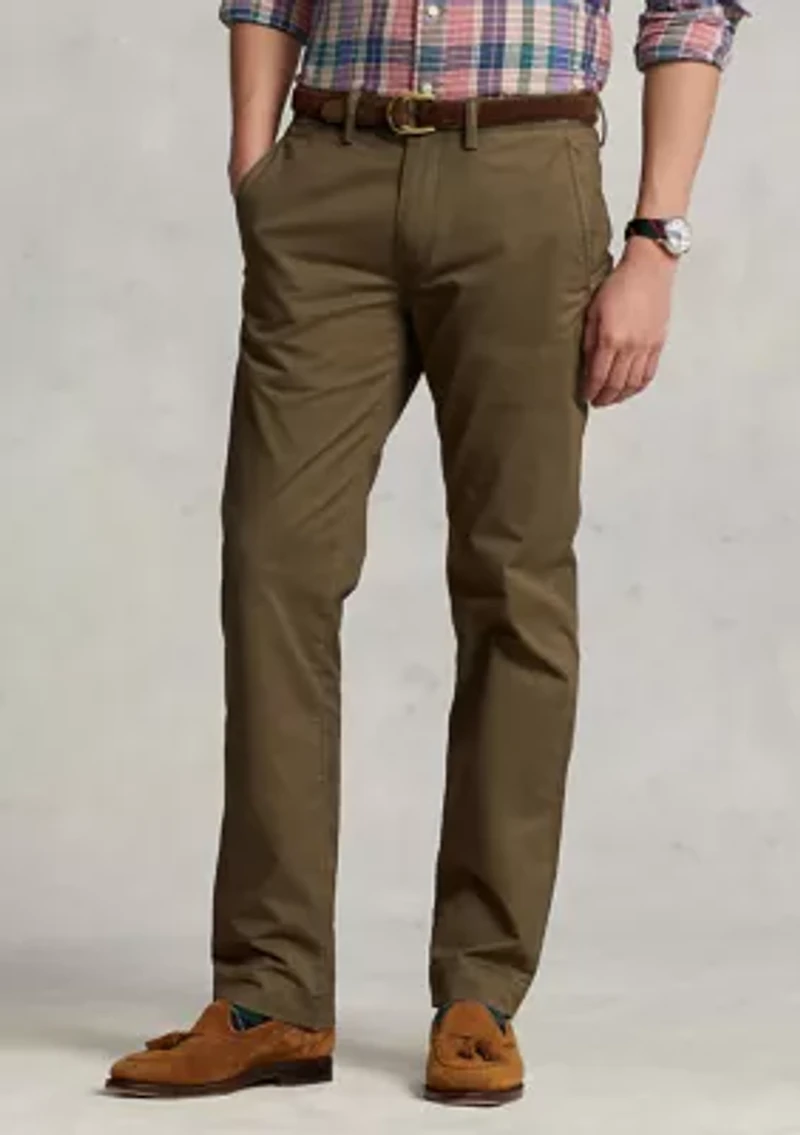 With their clean-lined construction and relaxed, straight fit, these cotton chino pants are reminiscent of early Polo style. Stretch Straight Fit: sits low at the waist. Straight through the leg. If you favored the Slim GI, Cooper, SPW, or Varick fit, you will like the Stretch Straight Fit pant. Size 32W has an 8.75" rise and a 15.5" leg opening. Belt loops. Zip fly with a buttoned closure. Two front angled pockets. Right hip coin pocket. Two back buttoned pockets. Signature embroidered Pony above the back right pocket. Model is 6'1" (185 cm) and wears a size 32W x 32L. Imported Material & Care 97% cotton, 3% elastane Machine washable