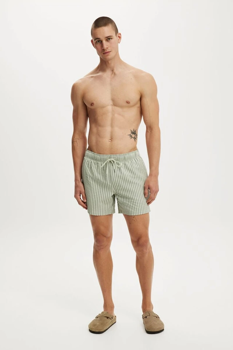 A pair of swim shorts cut from stretch fabrication with a green stripe seersucker pattern. Features full mesh lining and an elasticated drawstring waist for a secure, comfortable fit.
