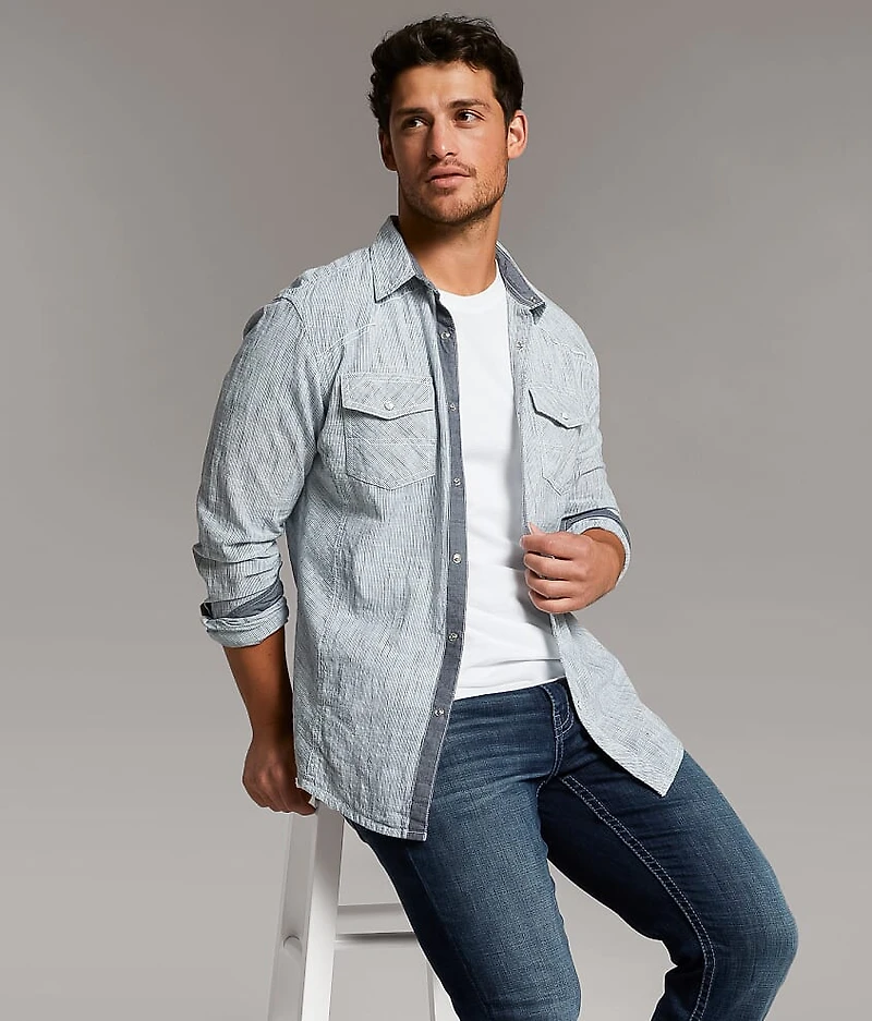 Woven snap front shirt Athletic fit is larger in the shoulders, chest, waist and arm holes and is longer in the arms and body Contrast trim