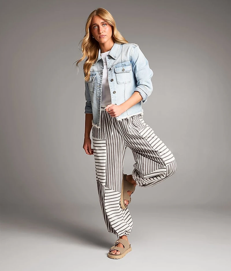 High rise knit jogger 26" inseam 26" cinch tie bottom opening Elasticized cinch tie waistband