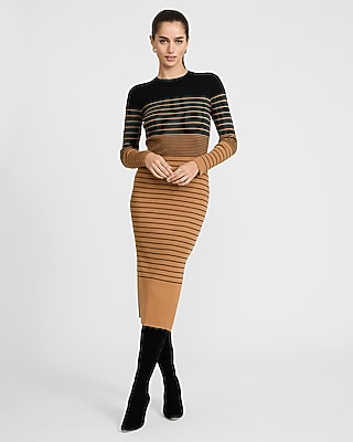 Perfect for cold weather dressing, this crew neck long sleeve design is a classy choice for layering during the cooler seasons. This sweater midi dress is complete with a neutral color blocked stripe print at the bodice, skirt, and sleeves.