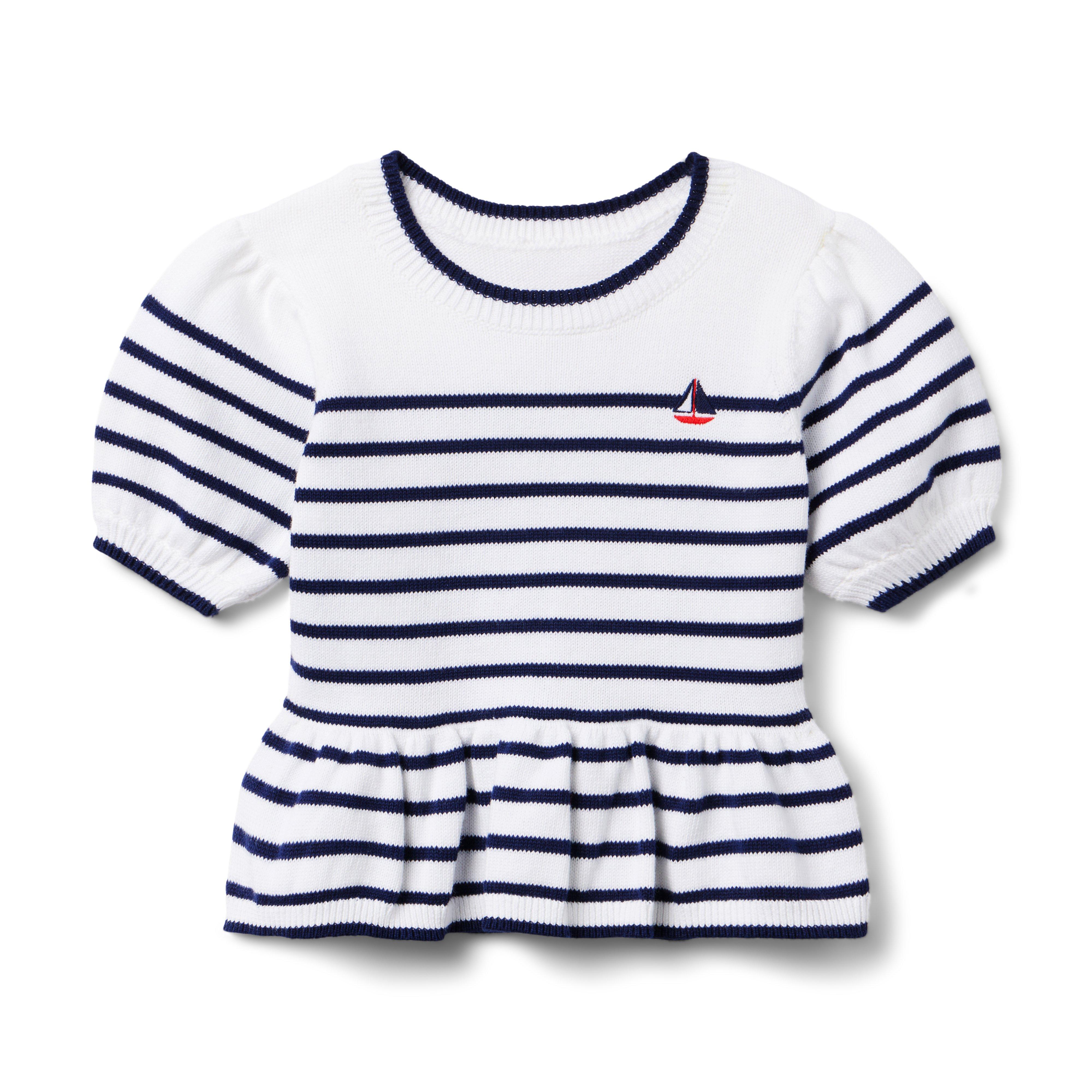 A nautical spin on a style we love. This soft sweater top with allover stripes, puff sleeves and a peplum hem. Plus, an embroidered sailboat icon for the perfect finishing touch. 100% Combed Cotton Short Sleeve Slightly Cropped Length Online Exclusive Machine Washable; Imported