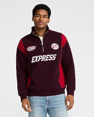 The warmth of your favorite sweatshirt and the visual interest of your favorite graphic tee meet in this quarter zip pullover. Featuring long sleeves, a mock neckline, and striped color block racing details.