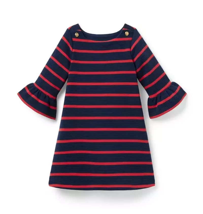 An effortless new favorite, featuring nautical-inspired stripes. Our soft knit dress is finished with elbow-length sleeves and ruffle cuffs. 68% Polyester Knit/31% Cotton/1% Spandex Long Sleeve Buttons At Shoulders Bloomer Included (Sizes Up To 18-24M) Online Exclusive Machine Washable; Imported