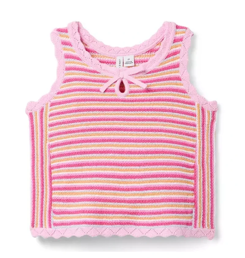 Our soft textured knit top features allover stripes, scalloped trim and a keyhole detail with a bow. Add it to your lineup. 100% Combed Cotton Sleeveless Matching Family Styles Available Machine Wash, Gentle Cycle; Imported