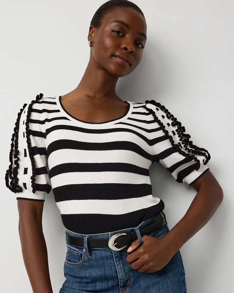 We gave this short sleeve pullover sweater with unique details. Ruffles on the sleeves add feminine charm, and variegated stripes add interest. So versatile, pair it with denim or pants.