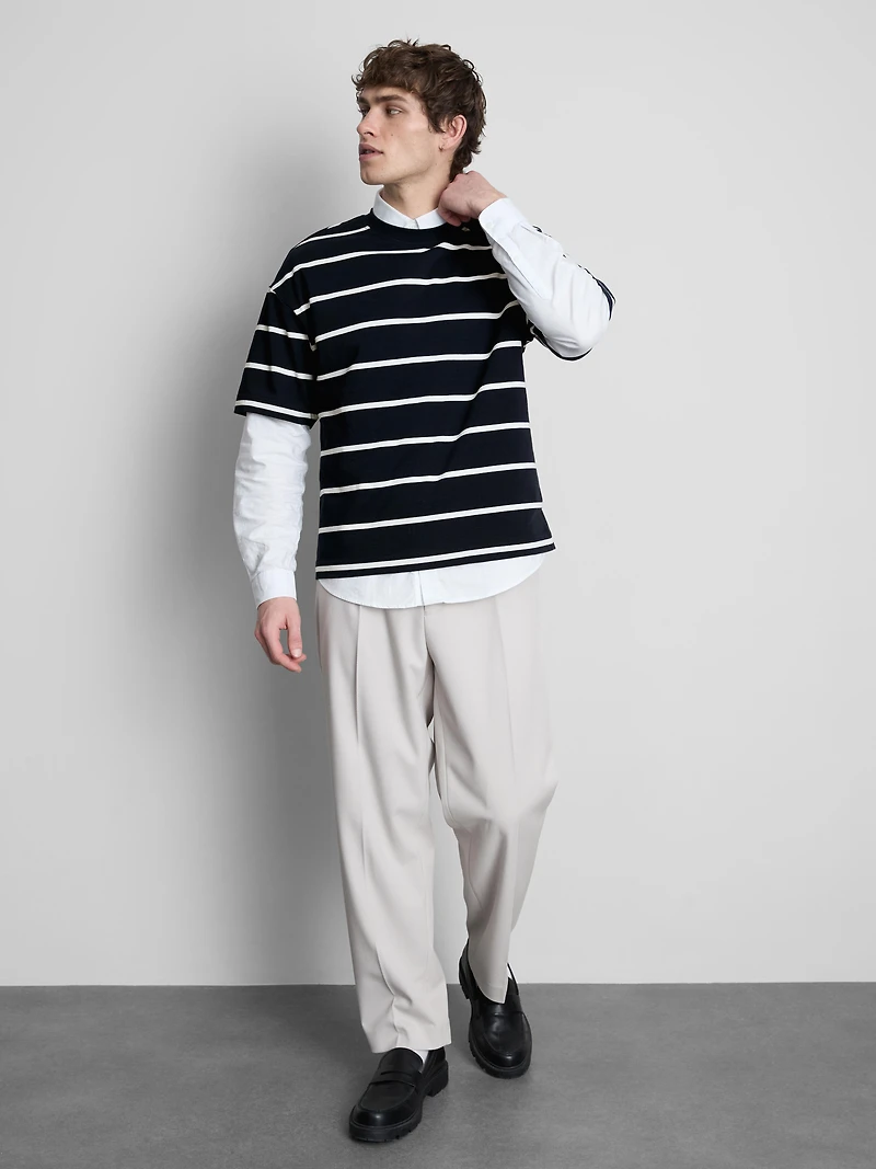 A boxy short-sleeve tee with a collar and stripe design