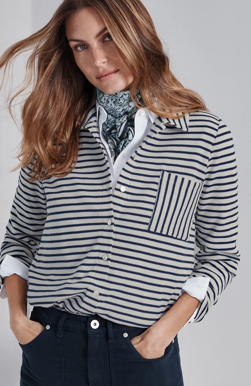 Rich in detail, this top is made in a textured waffle knit with shell buttons, a chest pocket, and directional stripes for a touch of graphic contrast.