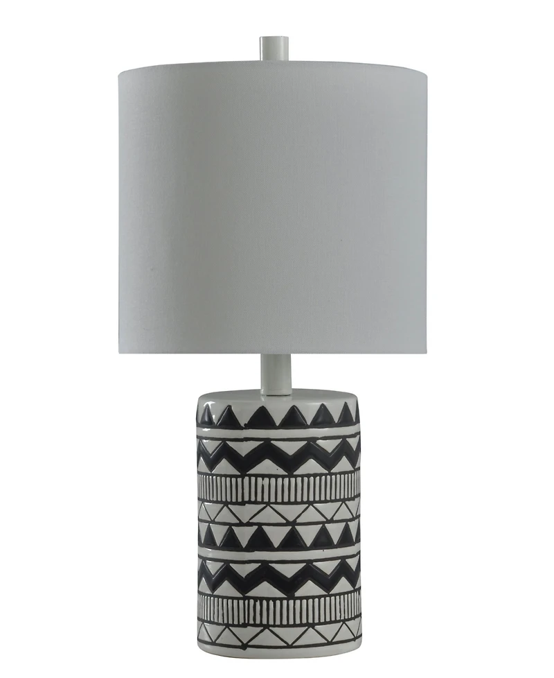 Made of ceramic and metal, this table lamp has a black and white print on the cylindrical body. Topped with a white shade, it's great for adding some interest and texture to your decor. It's suitable for side tables in the living room, nightstands or desks.