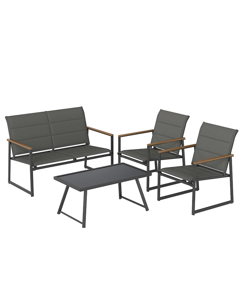 Elevate your outdoor experience with this versatile 4-piece patio set. It includes a loveseat, two chairs, and a coffee table, perfect for any space. The breathable fabric and padded seats ensure comfort, while the tempered glass table offers durability. Supported by a sturdy metal frame, this set promises stability and style for your gatherings.