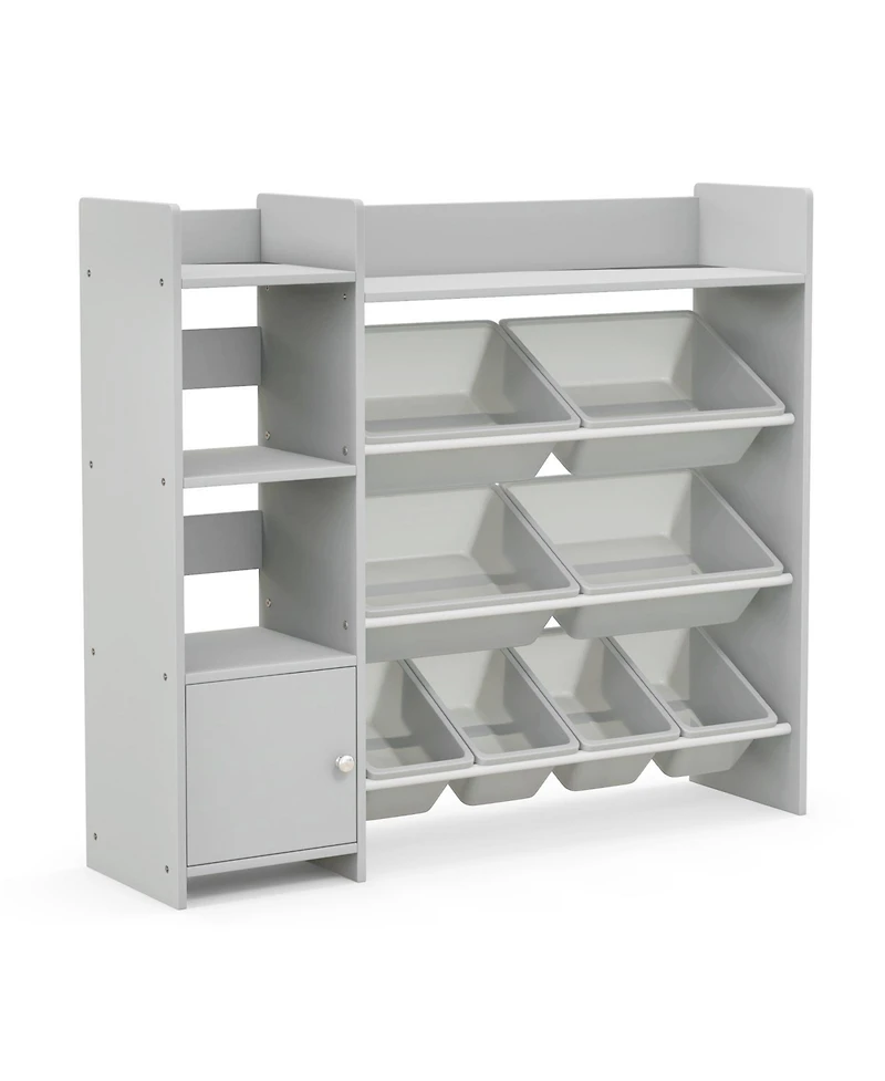 This multifunctional storage organizer combines bookshelves, toy bins, and a cabinet to meet your child's various needs. Suitable for bedrooms, living rooms, playrooms, and kindergartens, it offers ample storage with 8 removable bins and a top shelf with a raised edge. Made of high-quality Mdf and durable metal, it ensures stability and safety with rounded corners and anti-toppling devices.