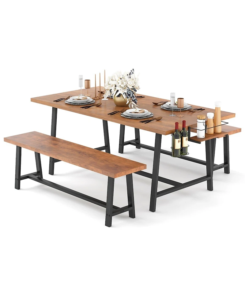Elevate your mealtime with our 3-piece dinette set, featuring a dining table and two benches, perfect for accommodating 5-7 people. This sleek and practical combo is ideal for intimate dinners or bustling family gatherings. Impress your guests with the smart storage addition of a 2-bottle wine rack and a convenient condiment holder. Built with a robust metal frame, the table supports up to 330 lbs, and each bench holds up to 440 lbs. The integrated footrests on both the table and benches offer ultimate relaxation. With an industrial style and easy-to-clean, anti-crack wood-grained surfaces, this set adds charm and convenience to your dining area.