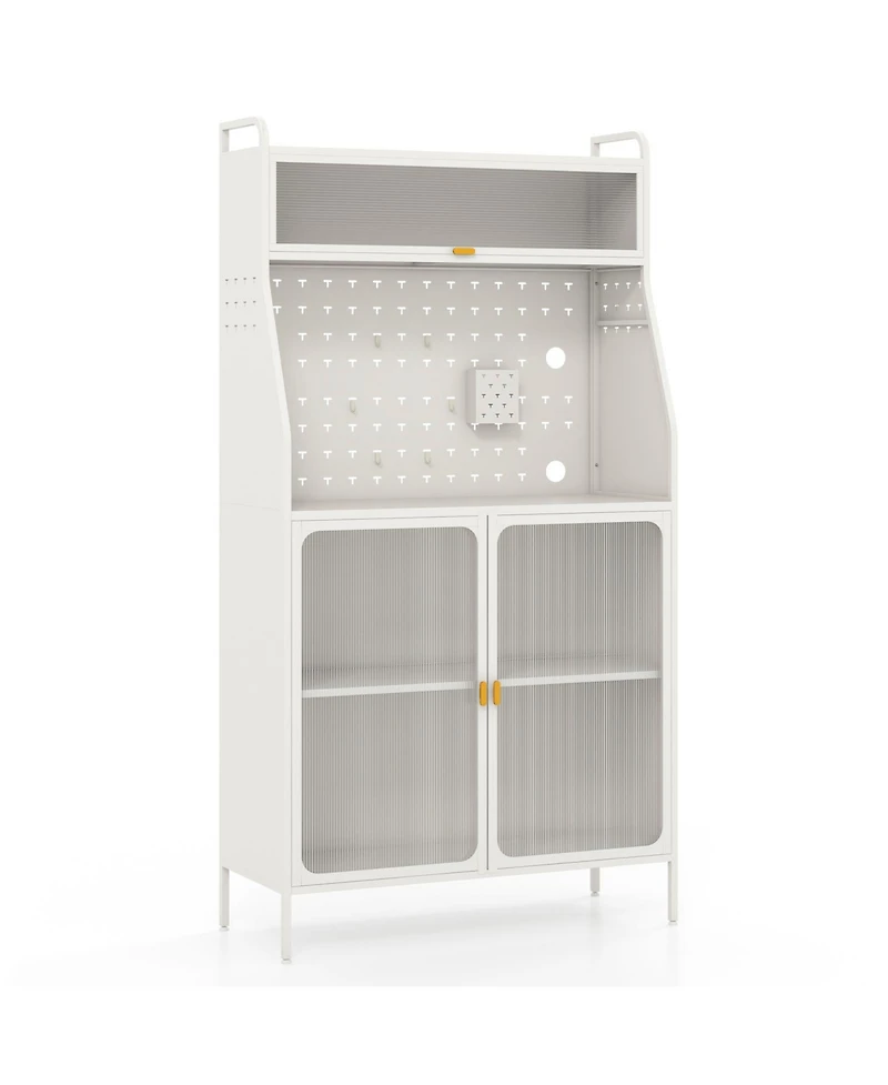 This versatile 5-tier pantry cabinet offers ample storage with a top shelf, flip door cabinet, pegboard, spacious countertop, and double door cabinet. Its adjustable shelf fits large appliances. With see-through doors, anti-tipping devices, and a multifunctional design, it suits kitchens, dining rooms, or offices, blending style and utility.