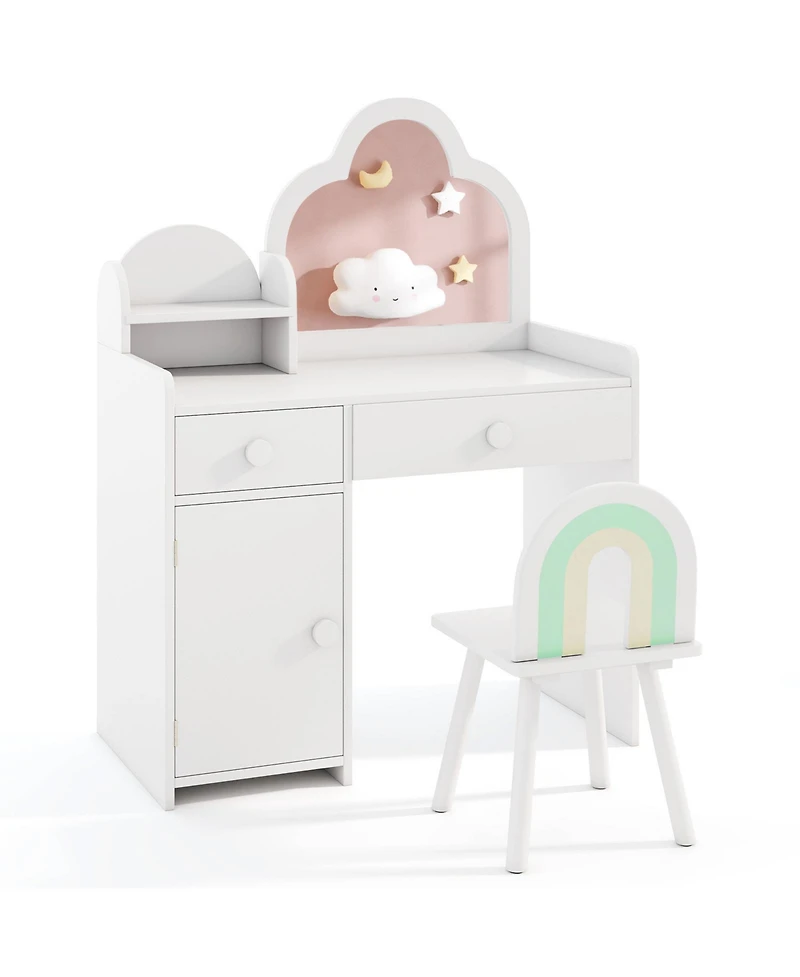 Sugift Kids Vanity Table and Chair Set with Cloud-shaped Mirror and Open Shelf