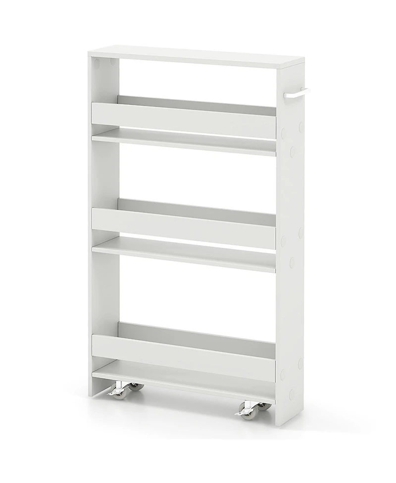 Maximize tight spaces with this narrow mobile serving cart designed to slide neatly into small gaps for instant organization. Measuring 19" x 5" x 32", it s a smart fit beside cabinets, between appliances, or in bathroom and laundry corners. Four open shelves make it easy to sort and store items like condiments, bottles, toiletries, or cleaning supplies, and the protective bars on each tier help keep items in place. Rolling casters allow convenient repositioning, with two lockable wheels to help hold the cart steady once it s in place. A side metal bar doubles as a push handle and a handy hanging spot for a towel or cloth. Built with an engineered wood frame, it offers a compact storage solution for kitchens, bathrooms, and living areas.
