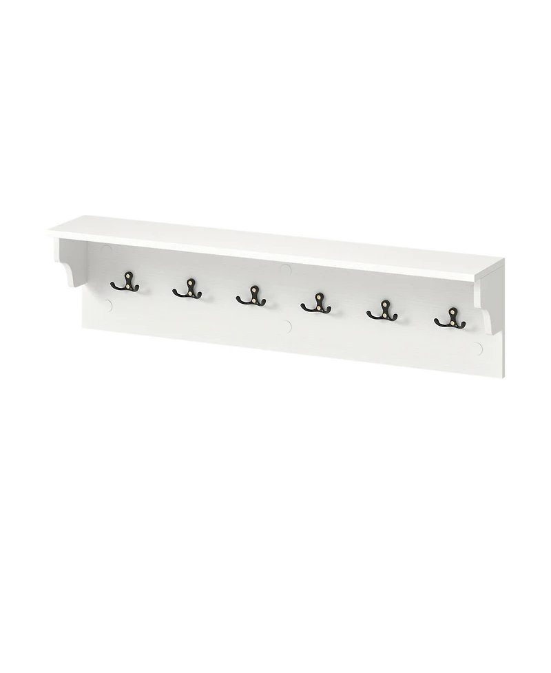 Enhance your home with this wall-mounted coat rack featuring a wooden top shelf and six sleek hooks. Perfect for organizing hats, towels, and more, its open design offers easy access while keeping items tidy. Ideal for any room, this elegant and compact piece combines functionality with style, ensuring durability with its robust wooden frame.