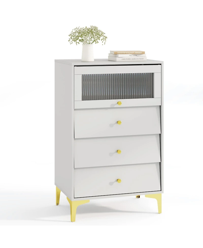Designed to streamline organization and enhance safety, this cabinet features three drawers for easy item arrangement, a flip up fluted glass door that combines beauty with space efficiency, and uniquely inclined drawer fronts for decorative appeal. Exquisite knobs and smooth slides ensure effortless operation, while an anti toppling design increases stability and security. Rounded corners provide safe handling, and four metal legs deliver outstanding strength. Anti slip foot pads add steadiness and protect floors. Suitable for bedrooms, living rooms, entrances, and more, its smooth surface simplifies cleaning. Assembly is required, and an installation guide is included