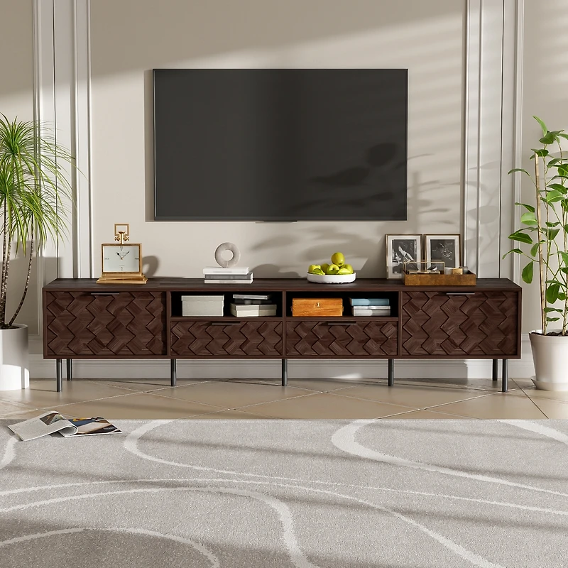 This modern Tv stand features a striking 3D diamond interwoven pattern, paired with sleek metal handles and sturdy metal feet for a bold, industrial inspired look. Designed to fit most 65 , 75 , and 85 inch TVs, it combines durable Mdf construction and solid iron legs with a 165 lbs total weight capacity and 25 lbs per panel support. Equipped with soft close hinges, integrated cable management, and a versatile storage layout including deep drawers, open shelves, and hidden compartments, it delivers quiet functionality, tidy organization, and standout contemporary style for any living space.