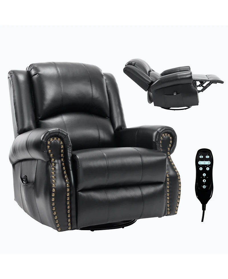 This 360degree(s) swivel and rocking recliner, built on a smooth black metal base, combines gentle rotation with soothing motion for ultimate relaxation. Easily adjust the backrest up to 155degree(s)using the side button for personalized comfort across sitting, lounging, or napping. Enjoy targeted relief with 8 individually operated vibration nodes across the back, waist, and legs, offering 3 massage modes and timed sessions (15/30/60 minutes), along with lumbar heating to boost circulation. Designed for hassle-free, tool free assembly (takes about 10 minutes), it arrives in one box. We recommend consulting your doctor before use if you have any health considerations.