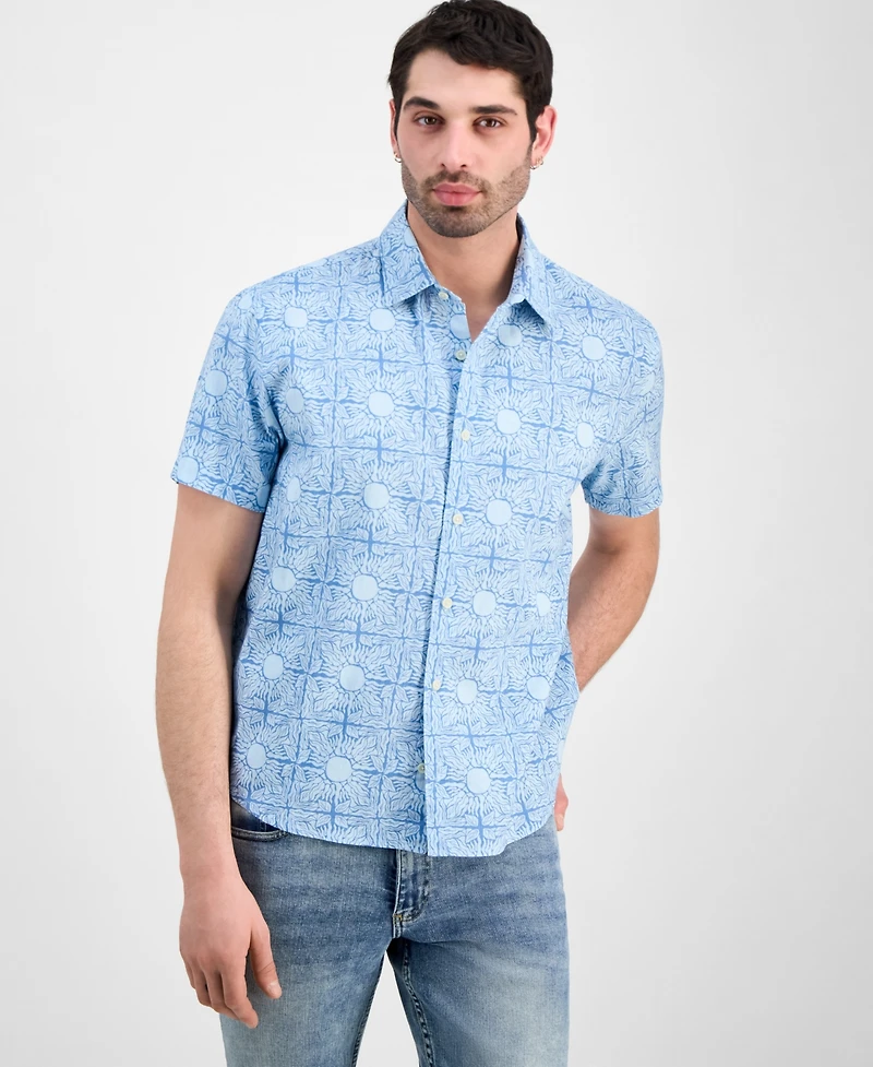 A floral medallion print imbues this Sun + Stone short-sleeve shirt with a warm Mediterranean-inspired vibe.