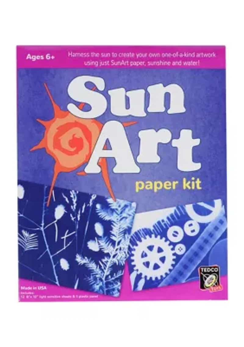All you need is sunshine, water, and your creativity to make unique and beautiful sun art prints! Place natural objects like flowers, leaves, shells, or even man-made objects on the sun-sensitive paper. Set outside on a sunny or overcast day or even indoors in a sunny window. Sit back and watch as the sun turns the paper a beautiful blue! Includes 12 sheets of paper and a clear acrylic sheet to hold your art in place. Perfect for school art projects, science fairs, or for home schooled creative fun! Recommended for 1 player, ages 6 and up. Made in USA. Package dimensions: 11.000 x 9.000 x 0.100 inches. Includes 12 8" x 10" Light Sensitive Sheets, 1 Plastic Panel. Wipe clean with dry or damp cloth. Imported Material & Care Plastic Spot clean only