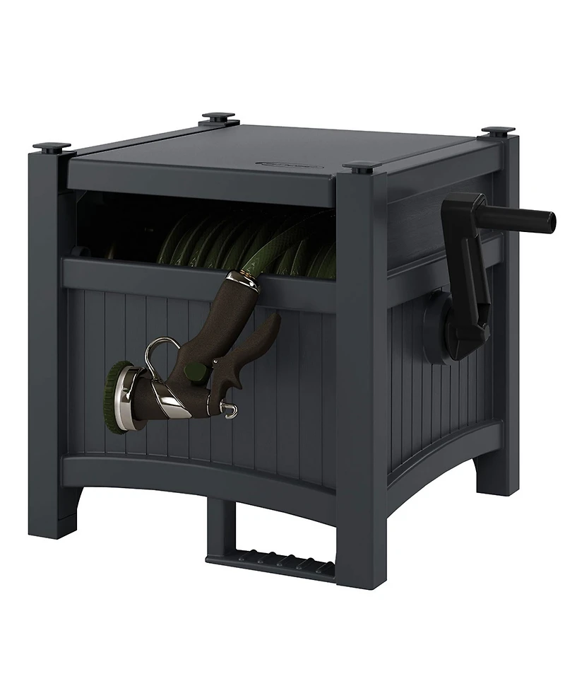Keep your yard neat with the Suncast CPLPHH100D Hideaway 100' Resin Garden Hose Reel for 5/8" hoses. This mobile reel offers a clean, organized solution with a stylish design that blends into your outdoor space. The patented Easylink system ensures a secure, watertight connection, while the crank handle and stabilizing footrest make winding and unwinding easy. Made from durable resin, it withstands outdoor elements and securely stores up to 100 feet of hose. Fully assembled for immediate use, it s perfect for watering, washing, or filling your pool.