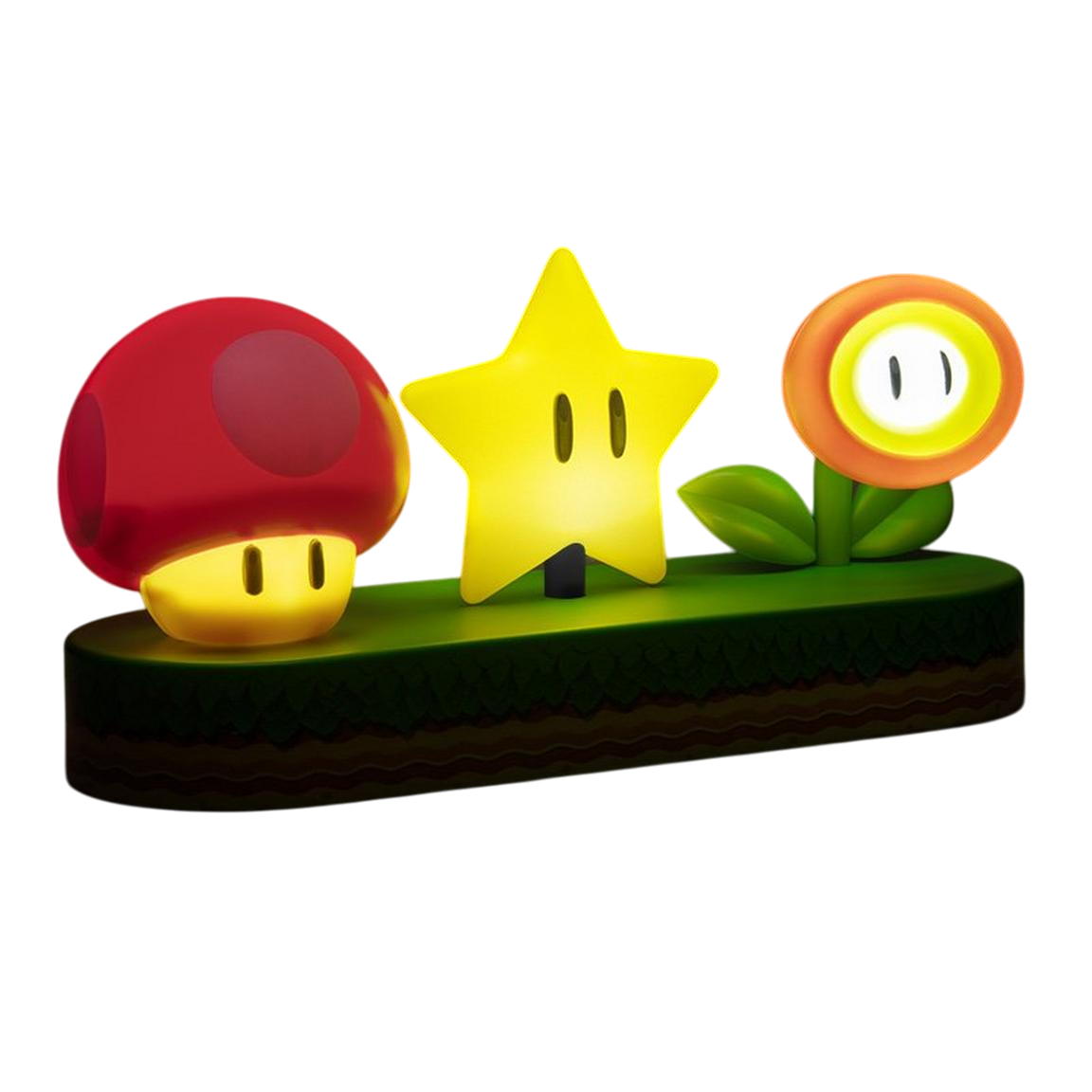 Level up your gaming space with this awesome Super Mario™ Icons Light. The 30cm (11.8") wide light has three power-up items arranged on its base. Turn the light on and watch Super Mushroom, Super Star, and Fire Flower light up. It also has a lighting phasing mode where each power-up lights up one at a time, as well as music reactive mode. Power the light with USB (cable included) or 3x AAA batteries (not included). The Super Mario™ Icons Light will make a great addition to any gamer's home.