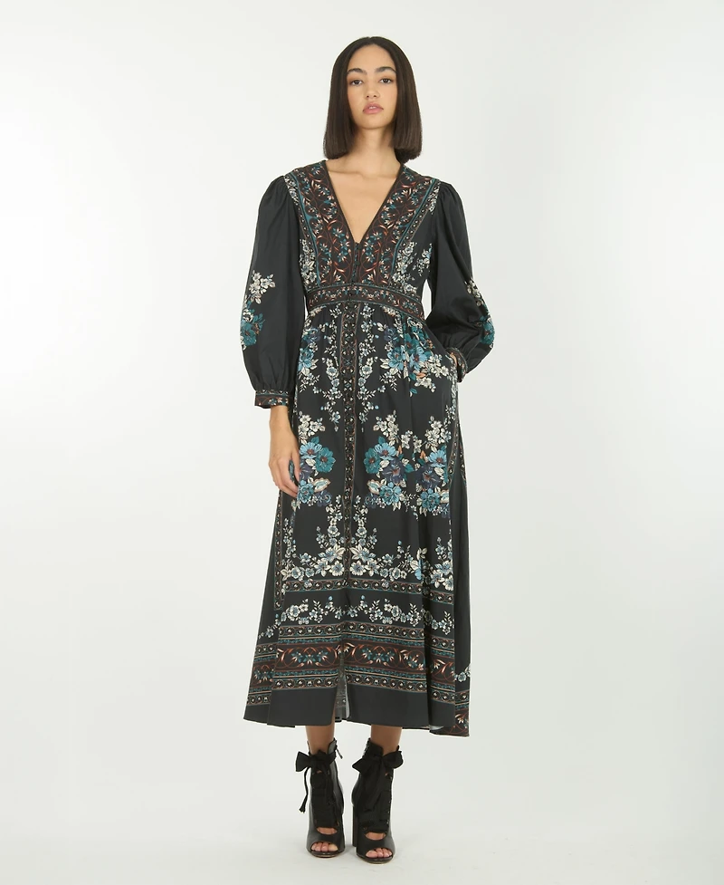 Super Natural by Secret Mission s Zaria Dress is crafted from 100% cotton, designed to capture effortless elegance in motion. Featuring a deep V-neckline, gathered empire waist, and voluminous sleeves, this maxi dress flows into a full, tiered skirt that moves beautifully with every step. The intricate Dark Navy Floral print draws inspiration from nature s quiet sophistication, offering a timeless balance of artistry and ease.