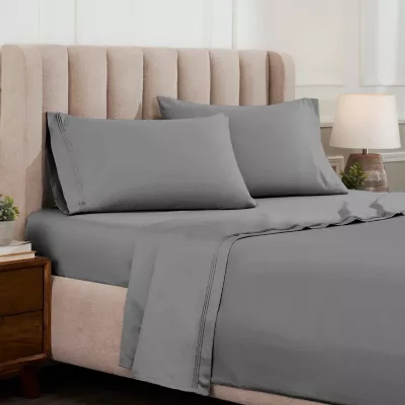 Upgrade your bed with this 4-piece sheet set, including one flat sheet, one fitted sheet, and two pillowcases. Made from 100% cotton with a rich 1500-thread count, it offers breathable softness and a smooth sateen finish with subtle shimmer. The fitted sheet features deep pockets to fit mattresses up to 18" thick, while the pillowcases have a 4" hem and side openings for easy use. Care: Machine washable. OEKO-TEX� certified for safety and sustainability. Sizes: California King: 72" x 84" fitted, 108" x 102" flat, 20" x 40" pillowcases, King: 78" x 80" fitted, 108" x 102" flat, 20" x 40" pillowcases, Queen: 60" x 80" fitted, 90" x 102" flat, 20" x 30" pillowcases, Heavyweight. Breathable. Luxuriously smooth.