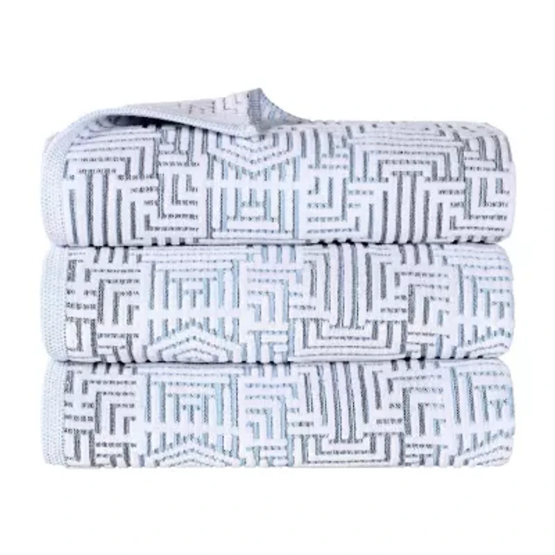 Experience ultimate comfort with the Cotton Modern Geometric Jacquard Plush Bath Towel Set of 3. Made from 100% cotton, these ultra-plush towels offer natural softness and impressive absorbency. Each towel features a textured jacquard geometric pattern, secure hemmed edges to prevent fraying, and a convenient hanging loop for easy drying. Available in Gold, Blue, Charcoal, and Platinum, this set complements modern to traditional bathroom styles. Crafted with durable single-ply thickness and STANDARD 100 by OEKO-TEX certification, these towels are safe, sustainable, and built to last. For best care, wash with like colors, tumble dry low, and remove promptly. Dimensions: 30" x 54" each. Soft. Durable. Stylish.