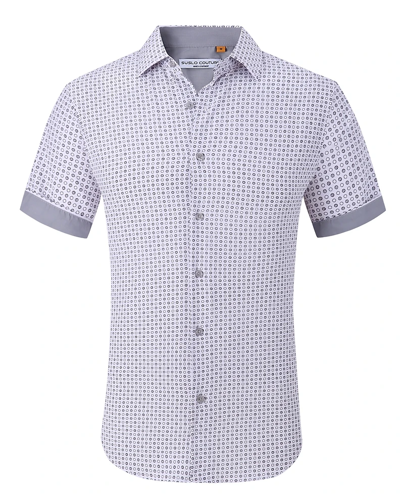 Custom-designed to ward off wrinkles as you move about your day, this entrancing geo-print button-down from Suslo Couture gives you a slim fit that stays breathable thanks to four-way stretch fabric.