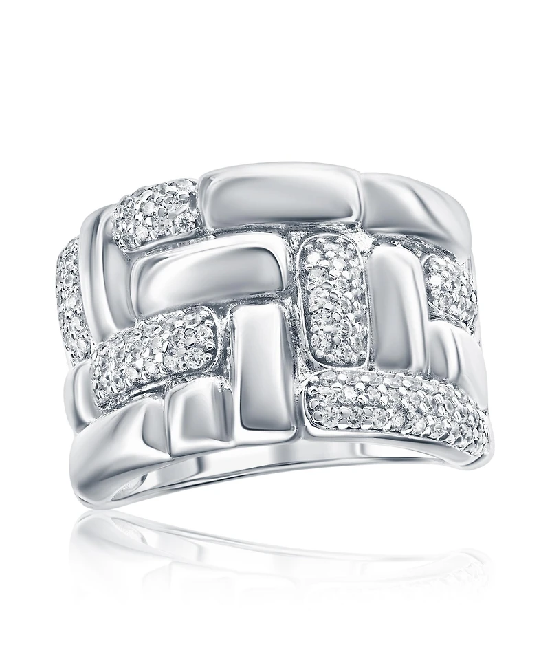 Suzy Levian New York Pave Cubic Zirconia Silver Puff Woven Motif Extra Wide Band Ring