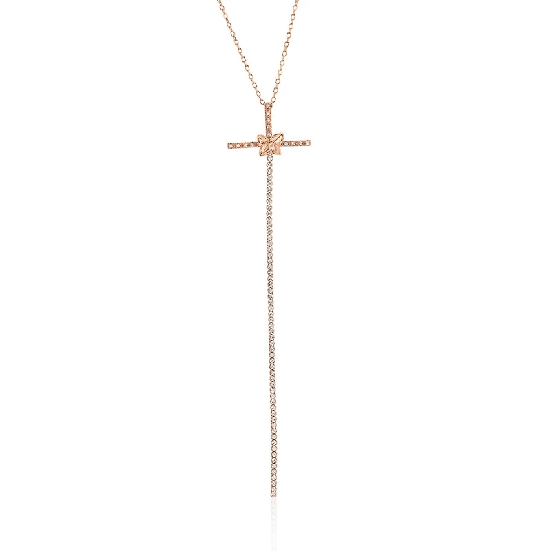 Suzy Levian New York Sterling Silver Cubic Zirconia Flower Accent Cross Long Line Drop Pendant