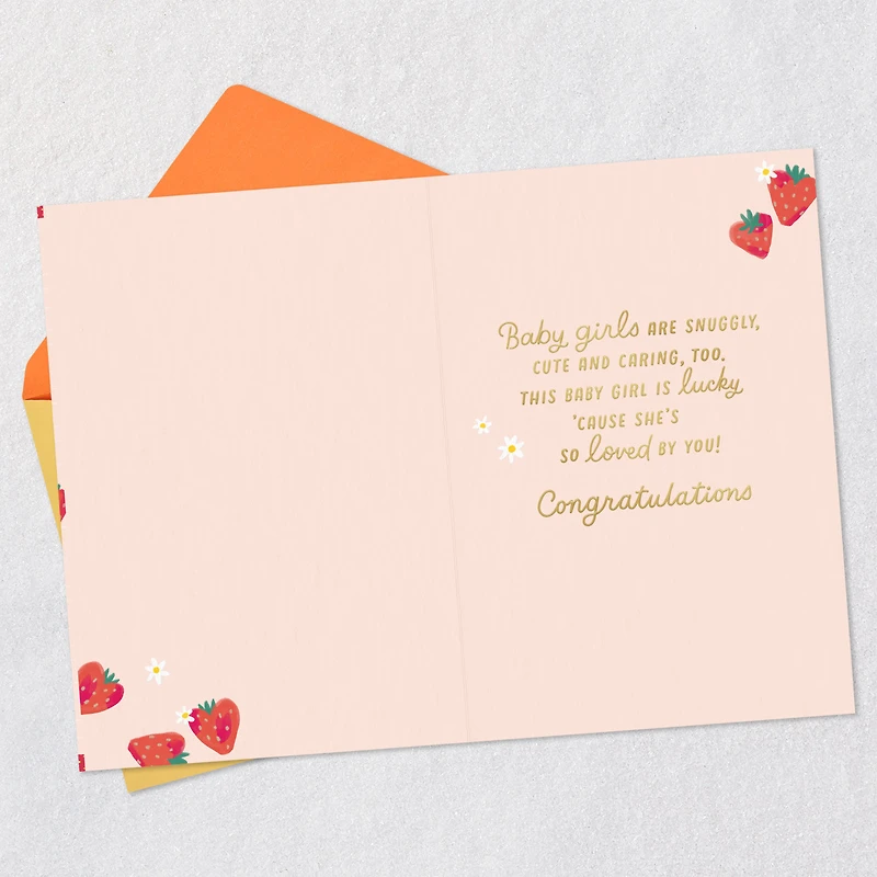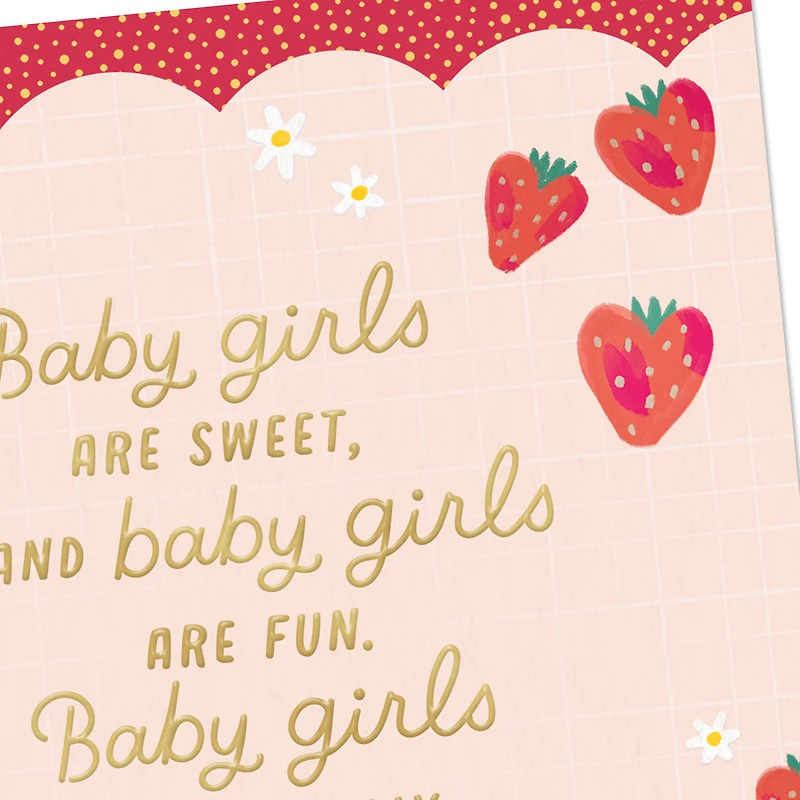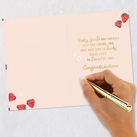 New baby girl greeting card features an illustrated design of strawberries and white flower blooms on a pink background embellished with red borders, scalloped edging and a sweet, rhyming message in shiny gold lettering. Glitter, foil and embossed accents.