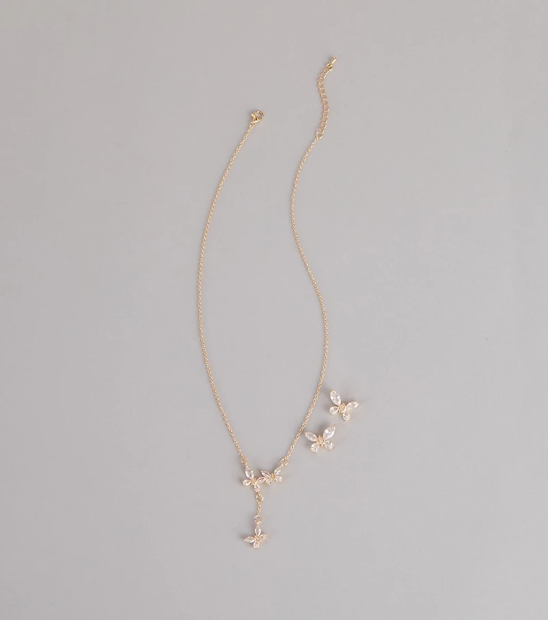 The kind of shine that catches compliments all night. This sweet rhinestone butterfly necklace and stud earrings set features a delicate lariat drop that layers effortlessly from brunch dates to dinner plans.