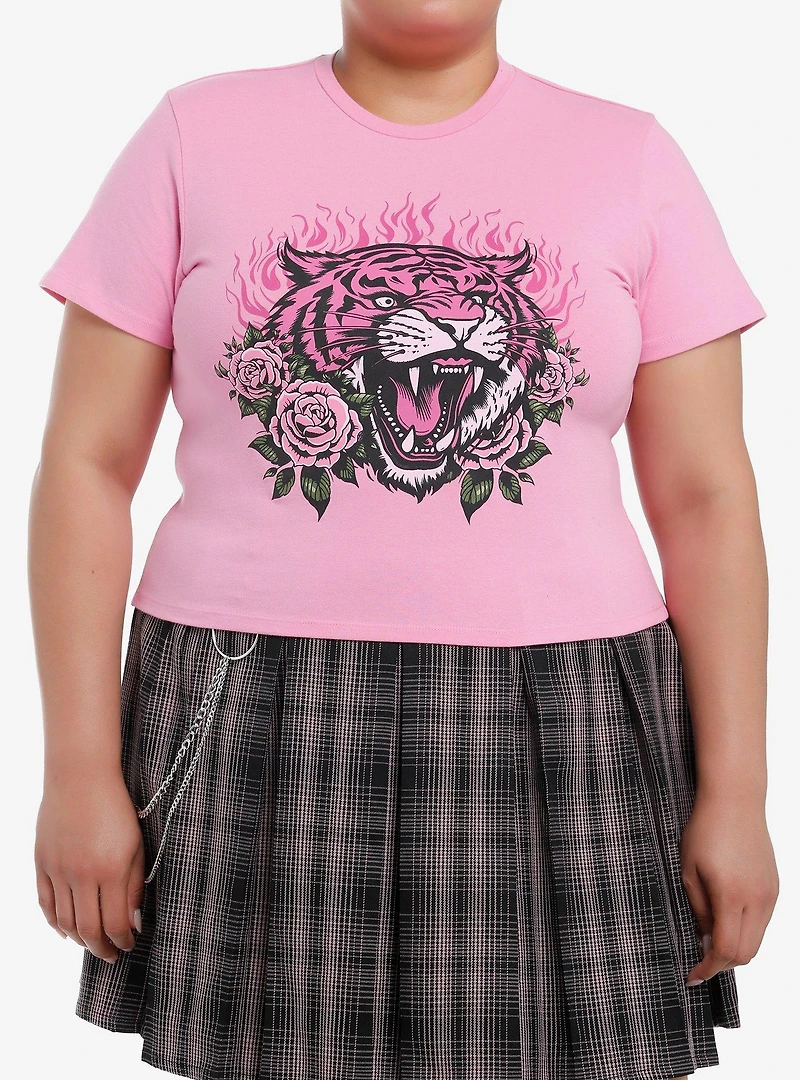 Throw it back to Y2K the Sweet Society way with this pink baby tee showing a graphic of a roaring pink tiger surrounded by pink roses, and pink flames in the background.