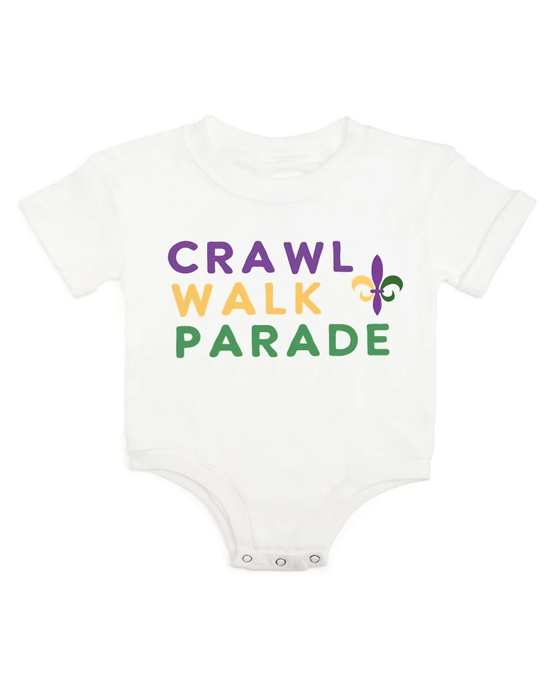 The Crawl Walk Parade Short Sleeve Romper is a fun and festive romper for any Mardi Gras celebration or everyday wear!