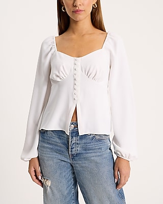 Created with a sweetheart neckline, long sleeves, and faux buttons, this flattering blouse is one you'll reach for time after time.
