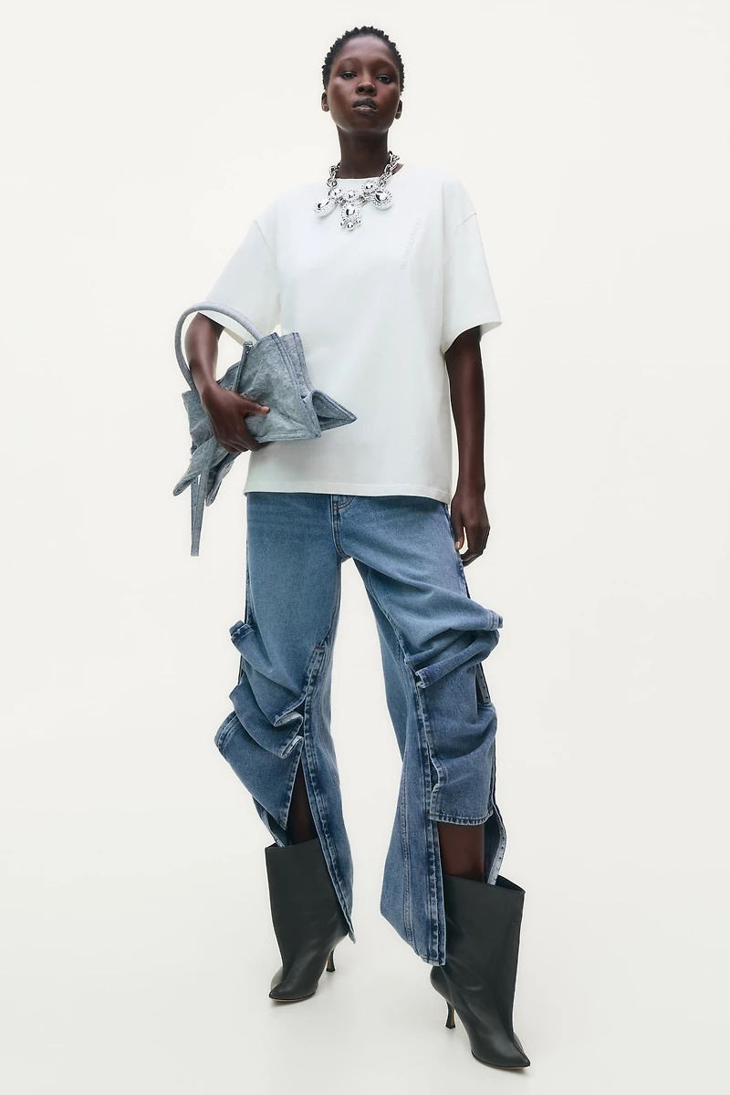 Loose-fit T-shirt in soft cotton jersey with the designer's logo embroidered on chest. Ribbed crew neck, dropped shoulders, and sleeves finishing just above elbows.