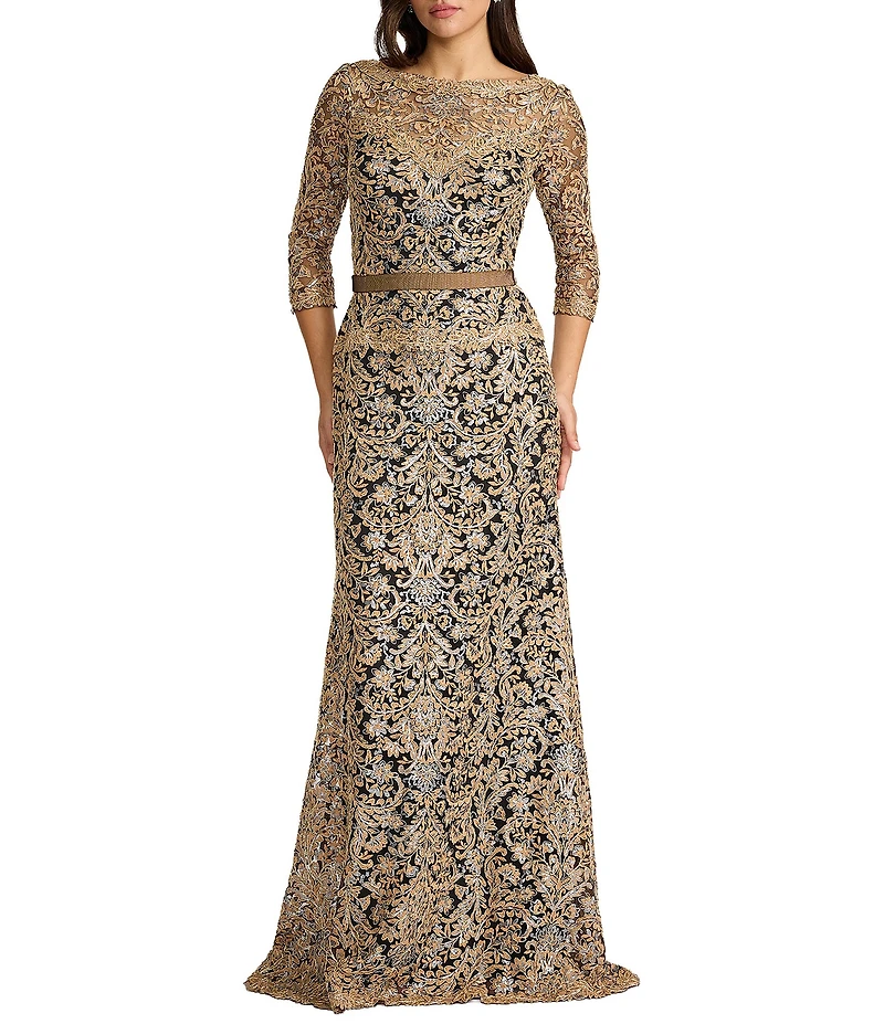 From Tadashi Shoji, this dress features:  Corded sequin lace fabrication  Sheath silhouette  Crew neckline   3/4 sleeves  Belted  Lined  Zip back closure  Approx. 63.25" length  Cotton/Nylon/Polyester  Dry clean  Imported.