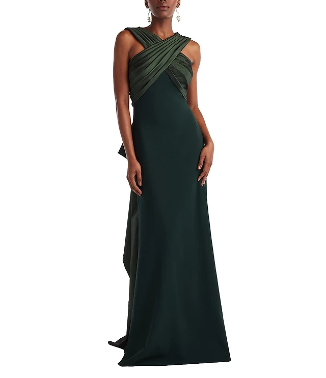 Tadashi Shoji Pleated Portrait Collar Ruffle Front Crepe Sheath Gown