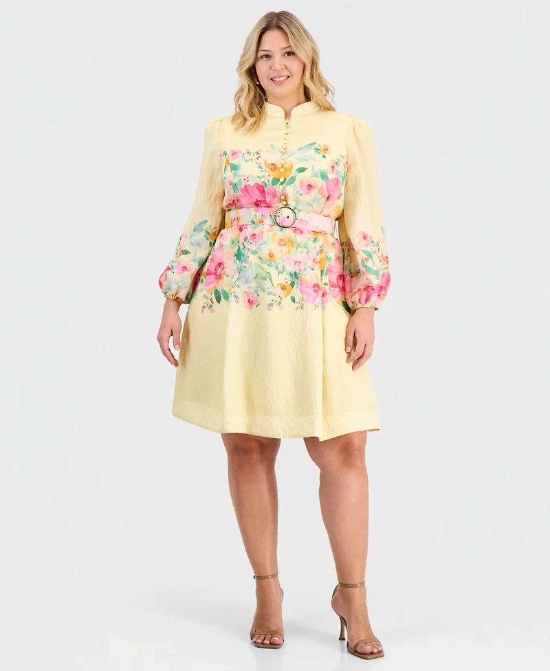 Tahari Asl Plus Placed-Print Belted Fit & Flare Dress