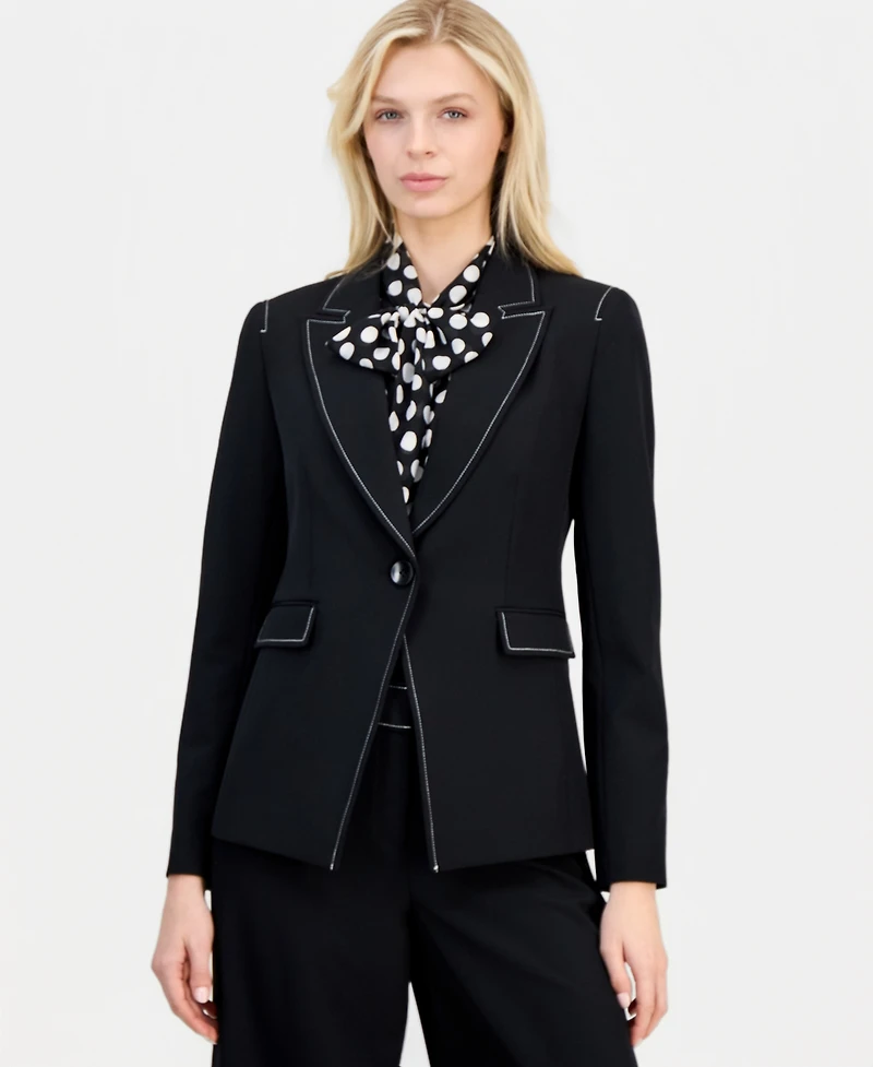 Defined by classic tailored style and outlined with bright contrast trim throughout, this Tahari Asl one-button blazer is a fresh silhouette to add to your workday rotation.