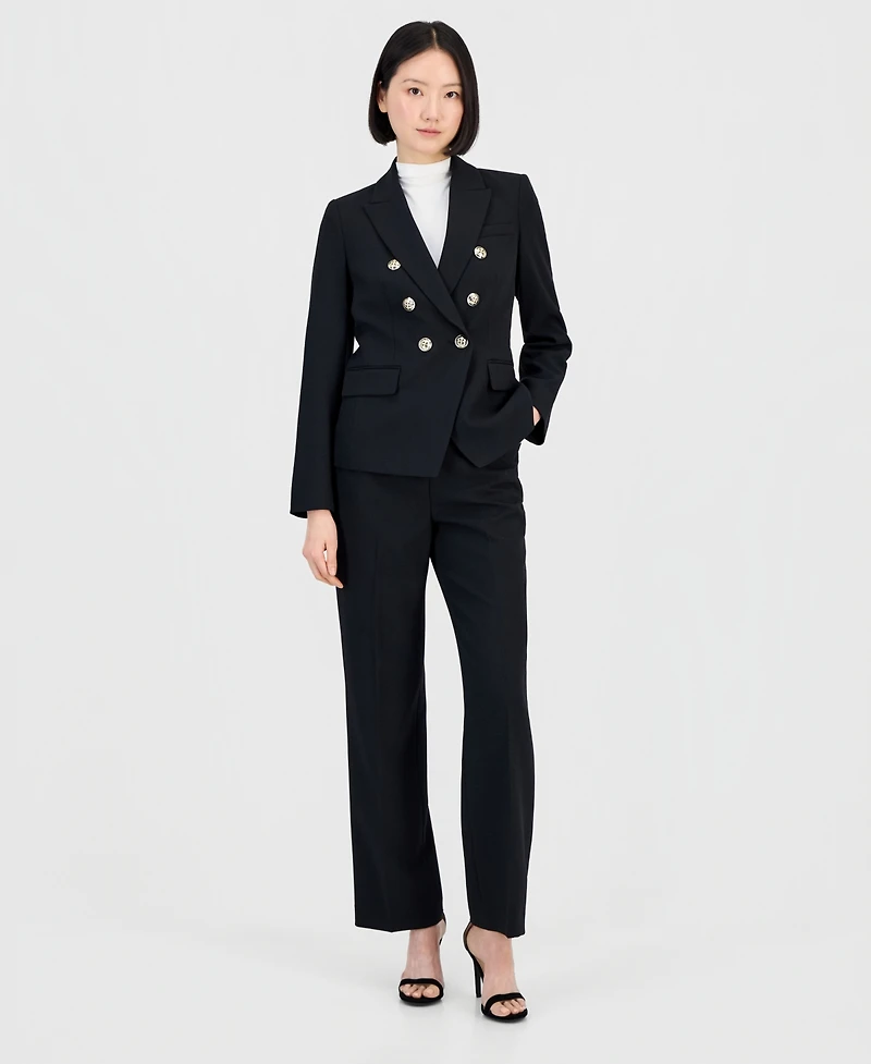 Tahari Asl's chic suit combines classic trousers with a fresh take on a double-breasted jacket. The cutaway front hem and peak lapels give this design extra polish.