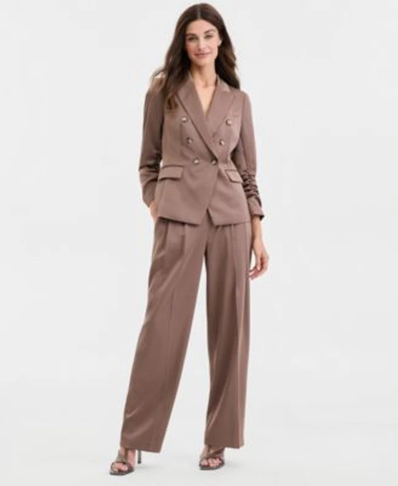 Tahari Asl Womens Matte Satin Double Breasted Scrunch Sleeve Jacket Pleat Front Wide Leg Pants